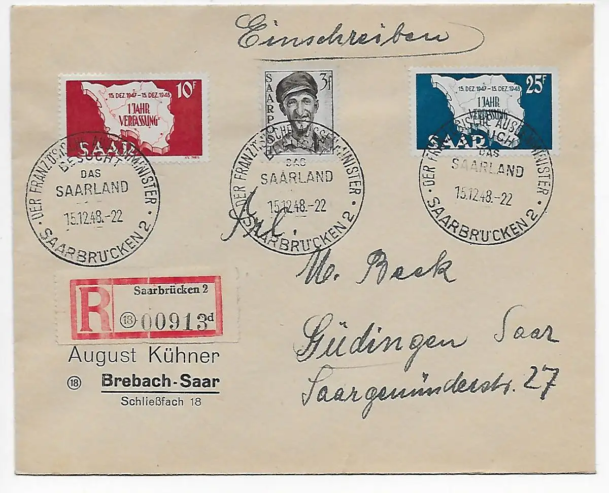Saarland 1948: Einschreiben Brebach: Der franz. Aussenminsiter nach Güdingen