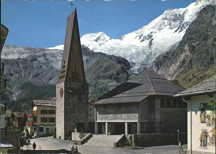 Saas-Fee Dorfpartie Kirche Alphubel Taeschhorn Gletscher Fassadenmalerei Saas Fee postalisch nicht gelaufen nach 1965 Erhaltung siehe scans Alte Ansichtskarte Postkarte hz Fhwoer