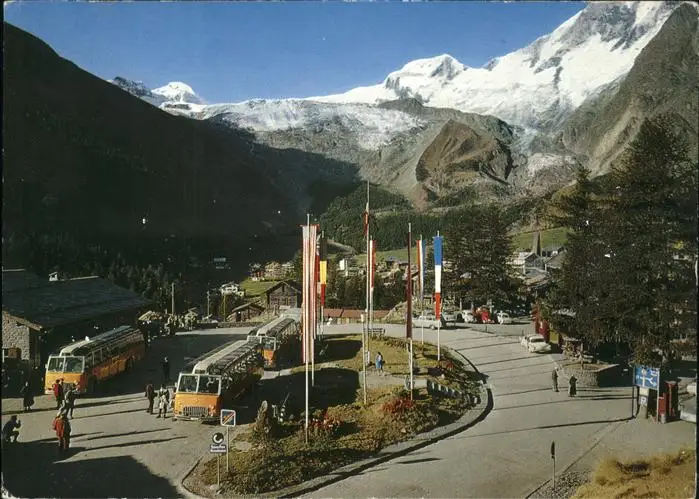Saas-Fee Parkplatz mit Feegletscher Saas Fee postalisch gelaufen 1921-1965 Erhaltung siehe scans Alte Ansichtskarte Postkarte BertBack