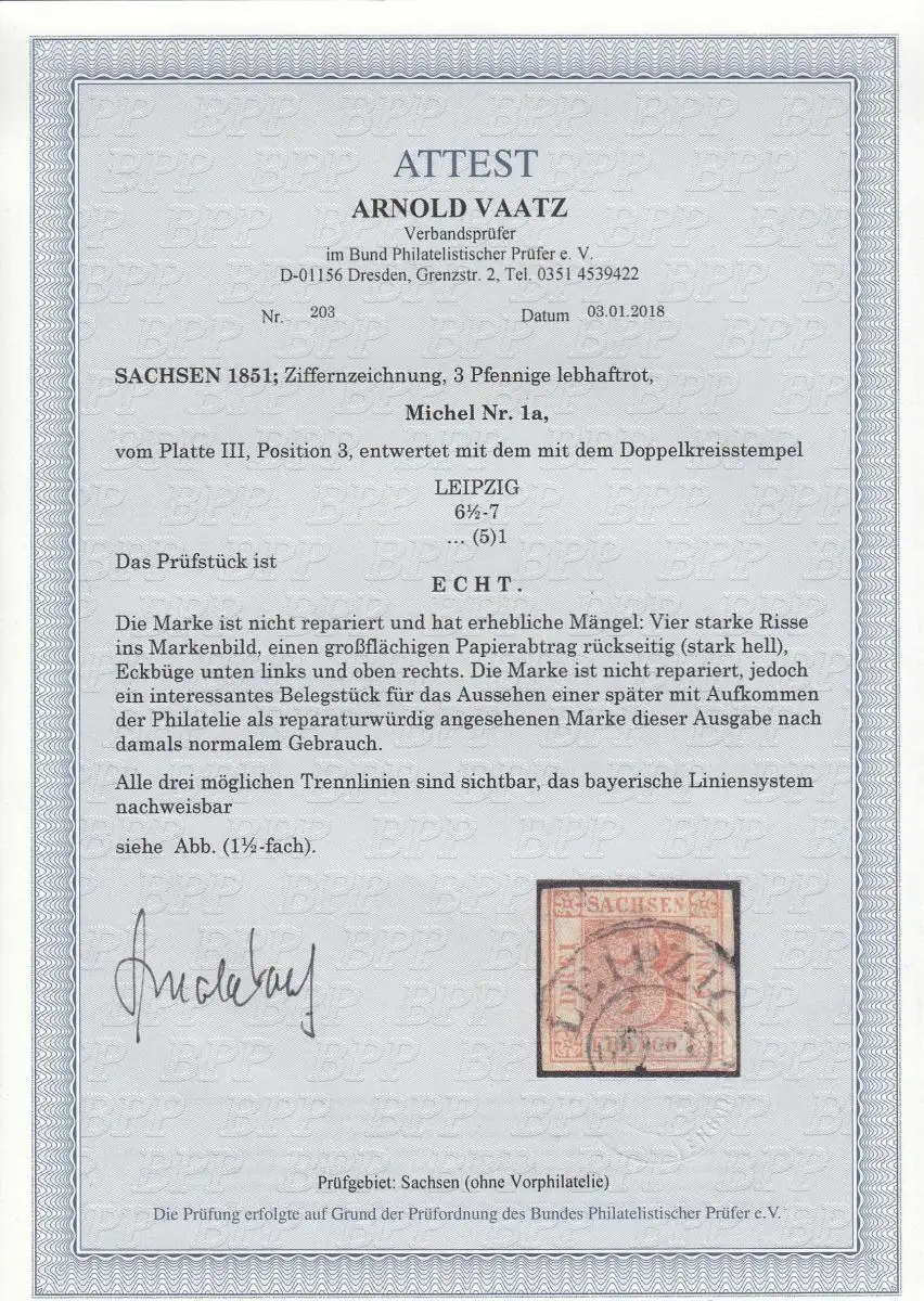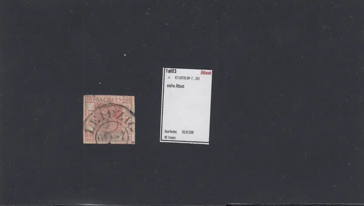 Sachsen: MiNr. 1a, Platte III, Position 3, gestempelt Leipzig, BPP Attest
