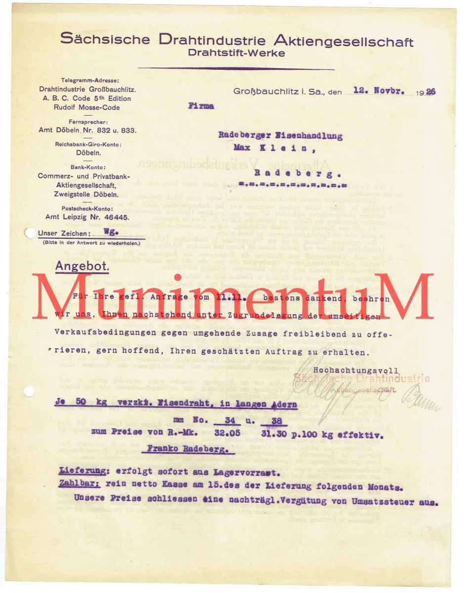 Sächsische Drahtindustrie AG Drahtstiftwerke GROßBAUCHLITZ Angebot Offerte 1926
