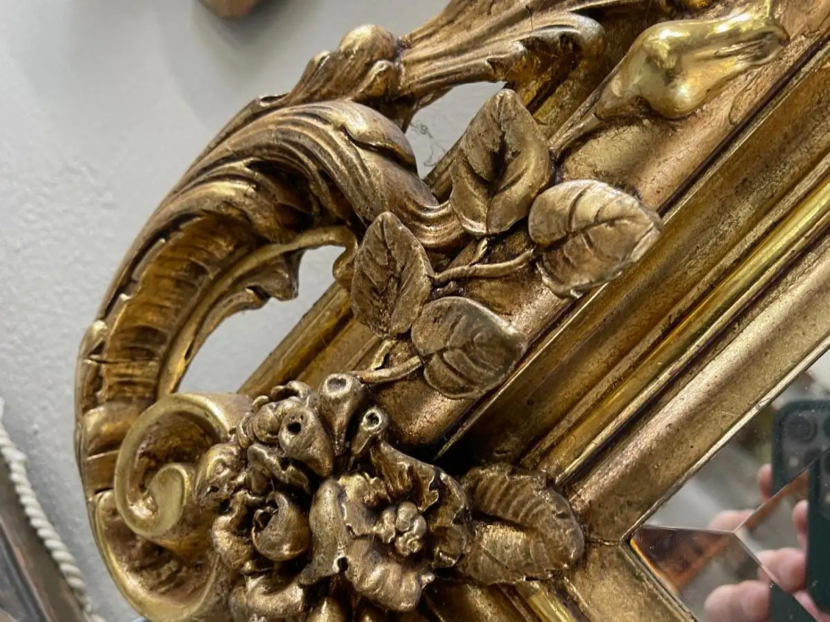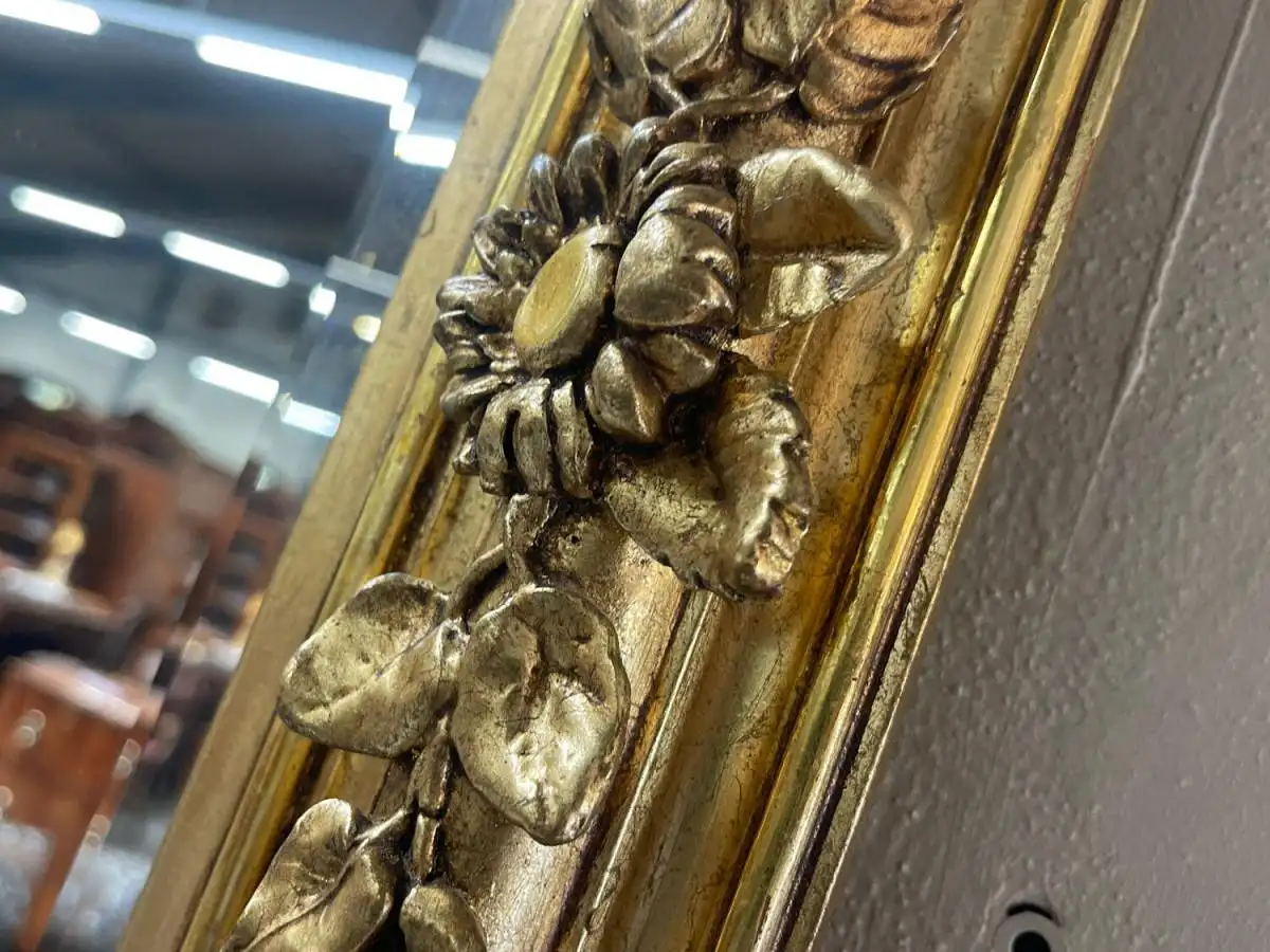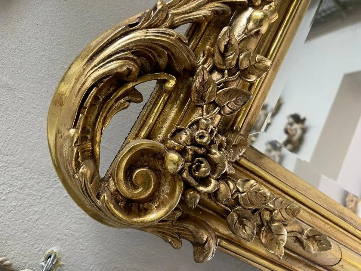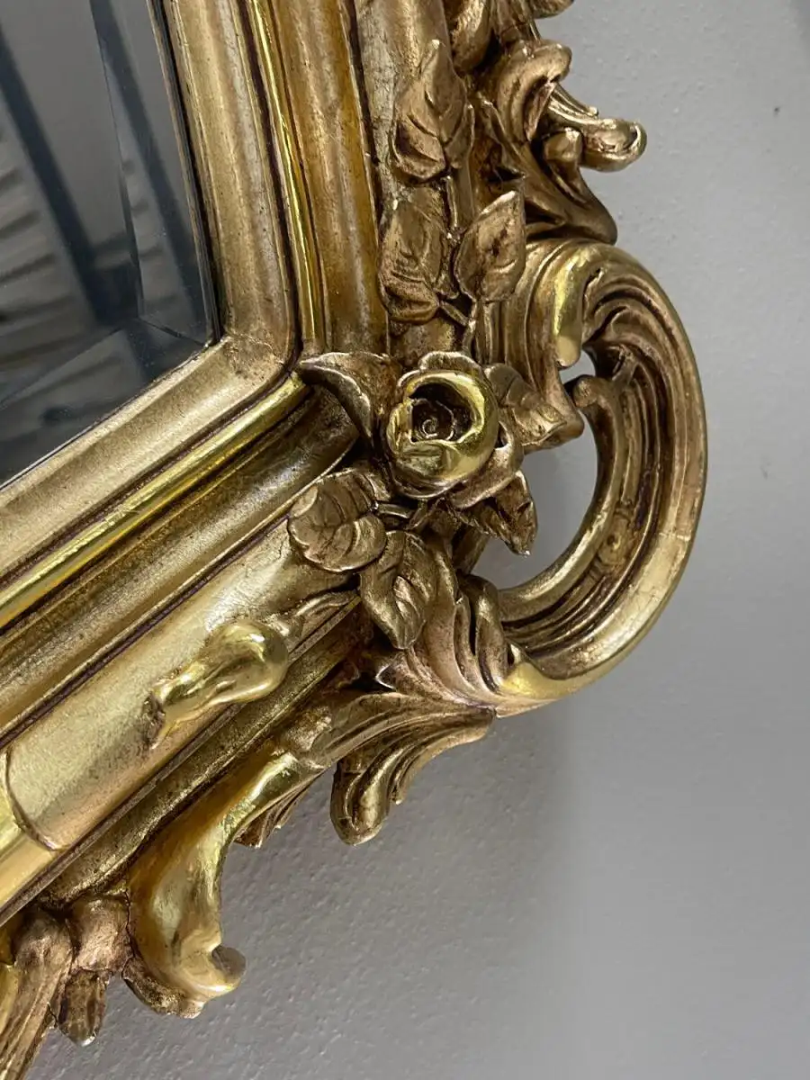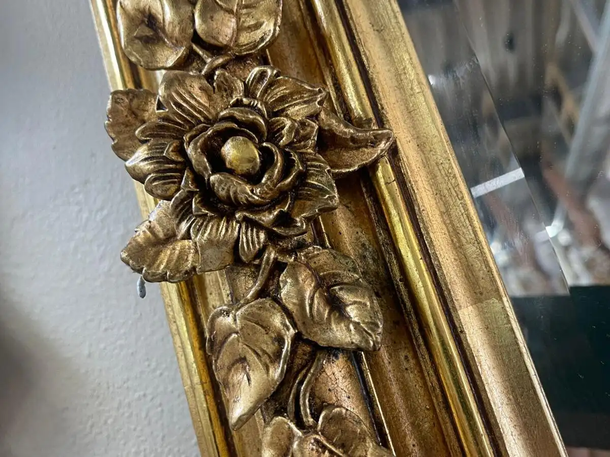 Florale Ornamente, zarte Rosen und kunstvolle Acanthusblatt-Schnitzereien zieren den Rahmen und verleihen ihm eine natürliche, lebendige Schönheit.