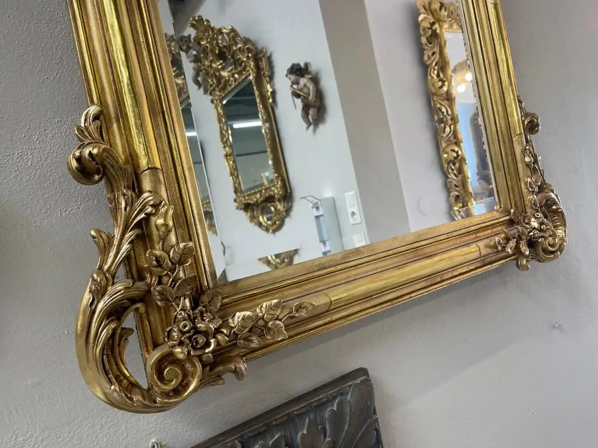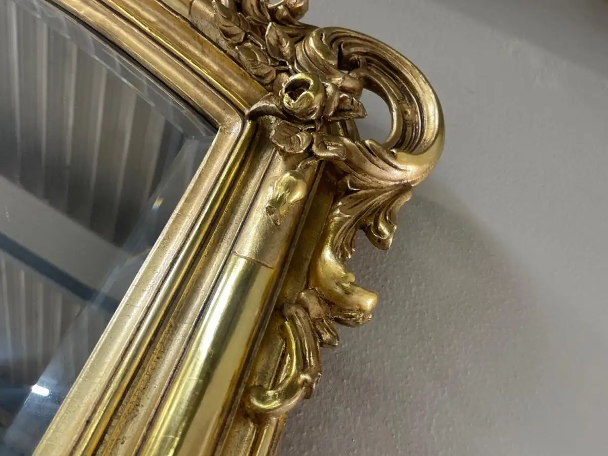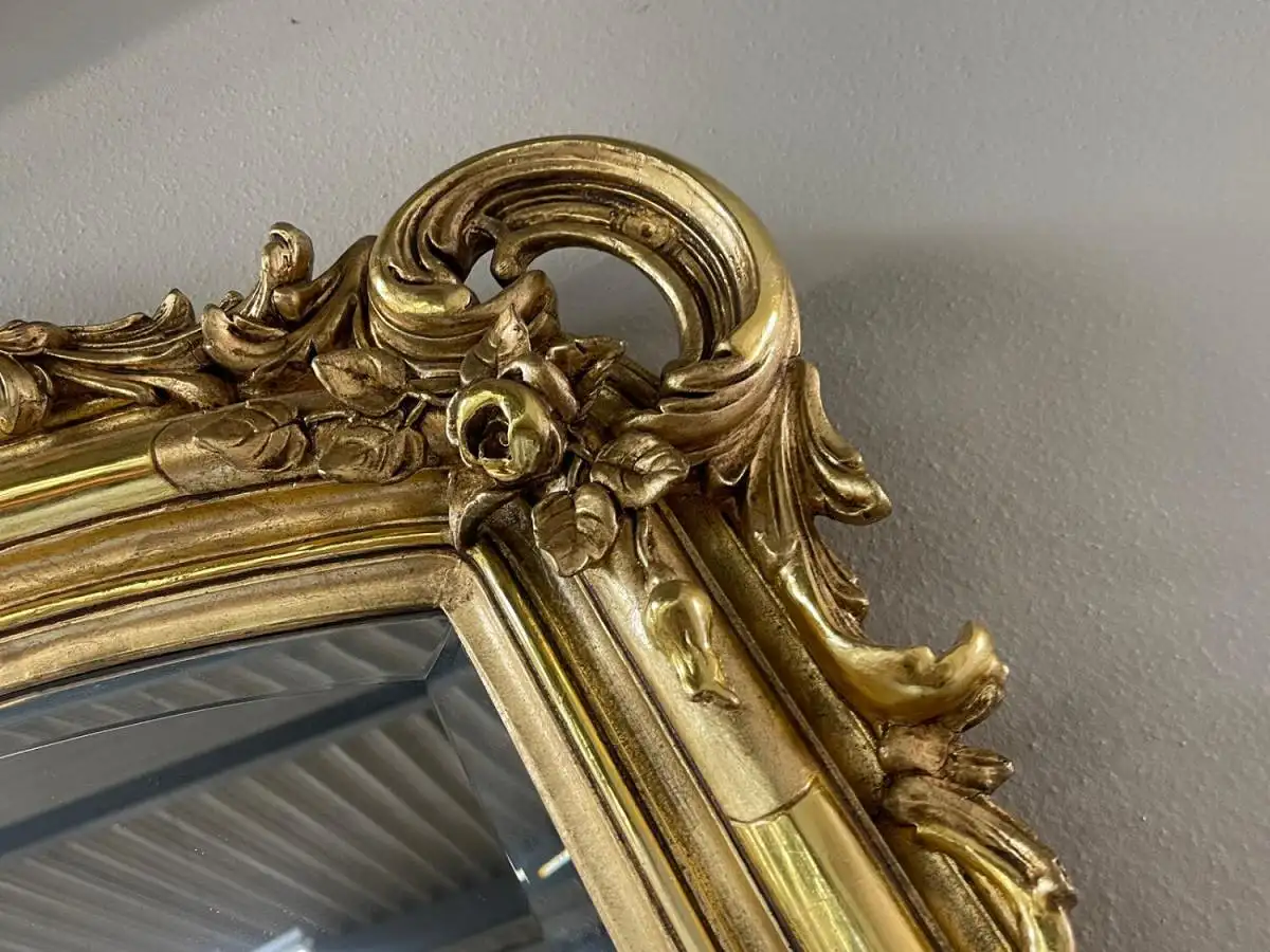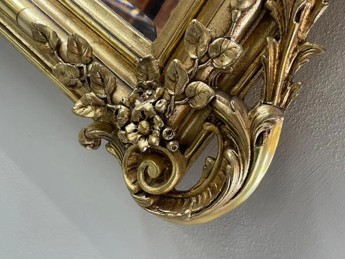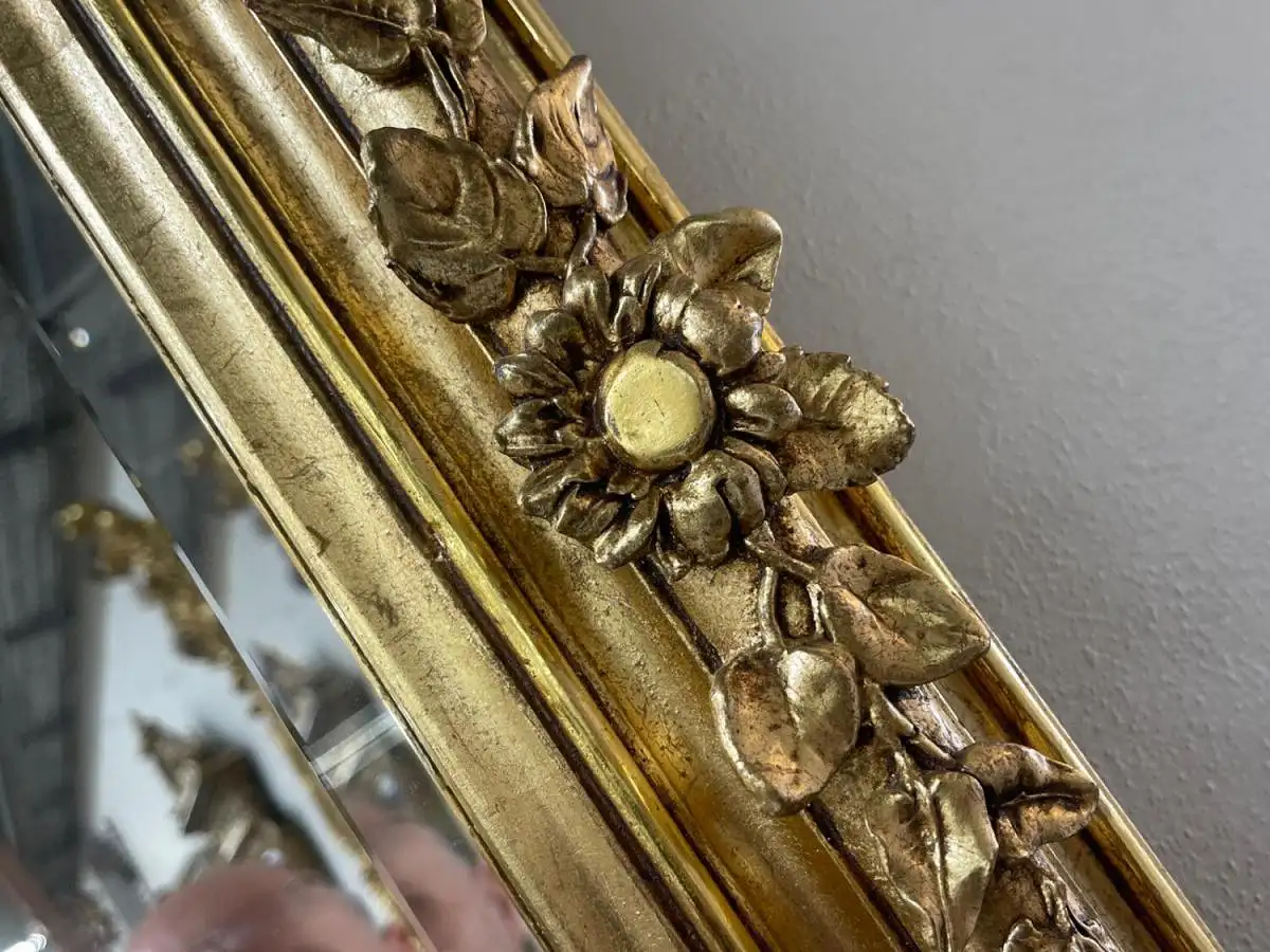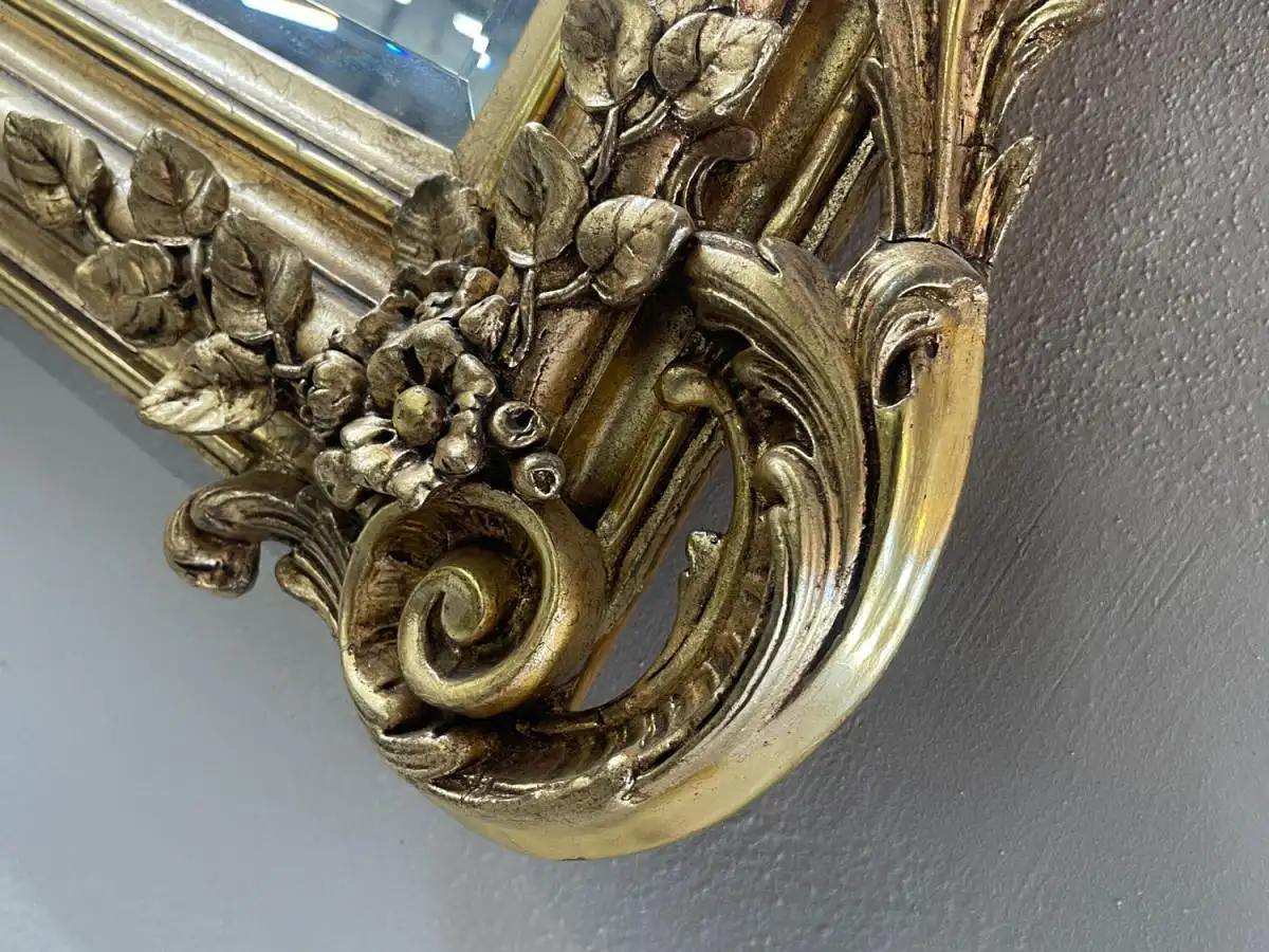 Florale Ornamente, zarte Rosen und kunstvolle Acanthusblatt-Schnitzereien zieren den Rahmen und verleihen ihm eine natürliche, lebendige Schönheit.