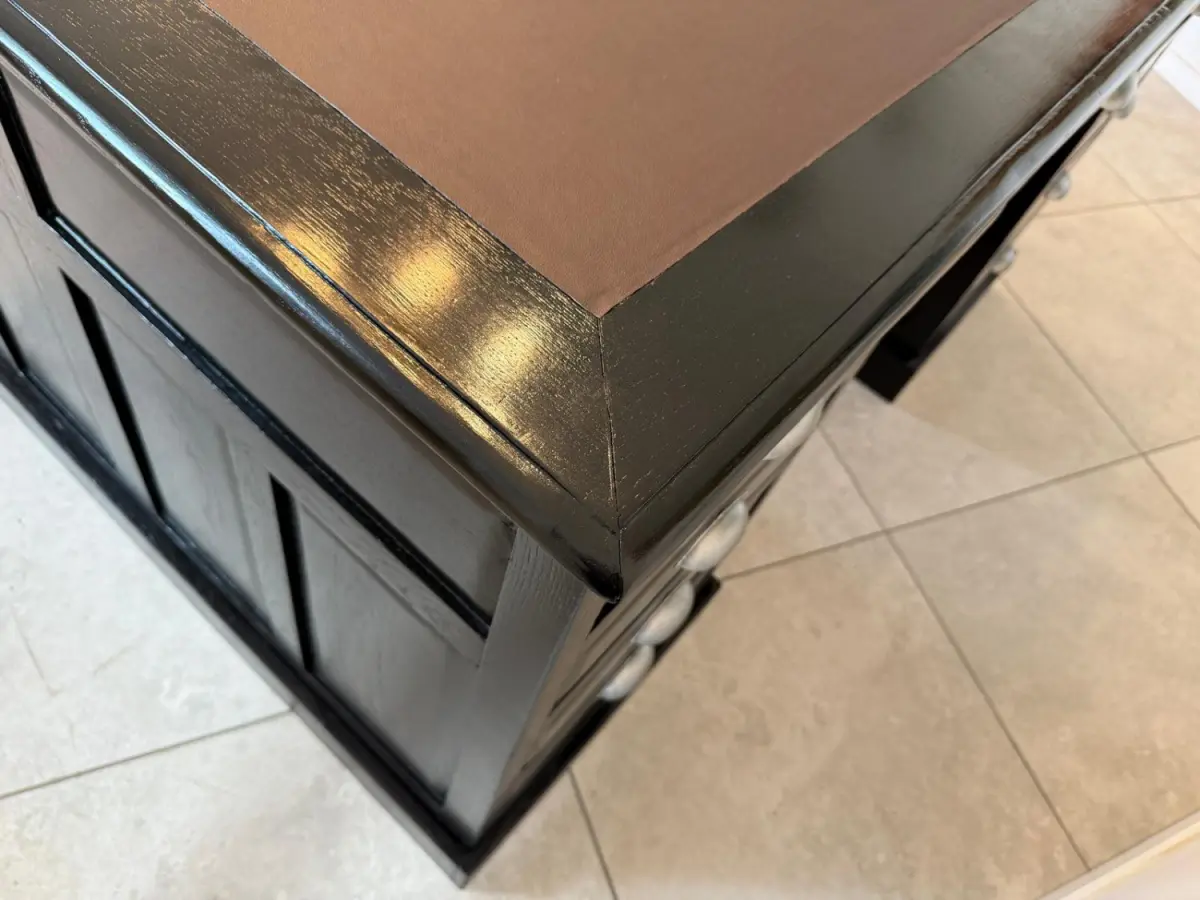 Der Schreibtisch ist beschlüsselt, innen wohlriechend und mit einer neuen, eleganten Schreibfläche in dunklem Leder ausgestattet.