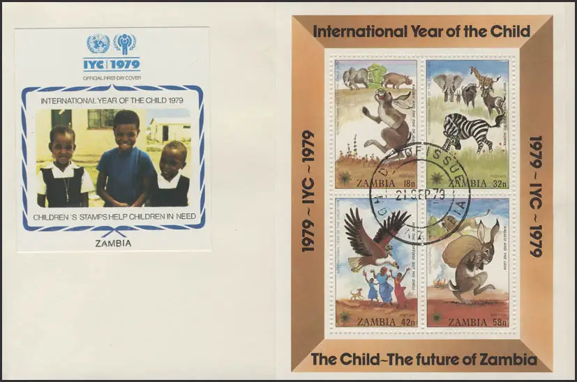 Sambia: Afrikanische Märchen, Block mit 4 Marken auf Schmuck-FDC