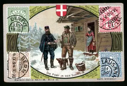 Sammelbild Berlin, Rud. Herrmann Seifenfabriken u. Parfümerie, Zossnerstrasse 60, Schweiz, Die Post in der Schweiz