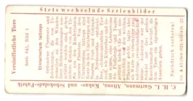 Sammelbild Gartmann Schokolade, Serie 645, Bild 1, Vorsintflutliche Tiere, Uintatherium laticeps