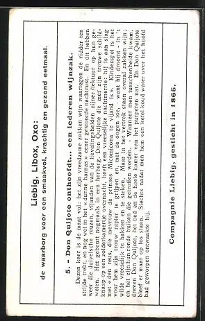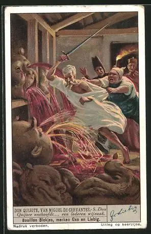 Sammelbild Liebig, Don Quijote, Van Miguel de Cervantes, Don Quijote onthoofdt een lederen wijnzak