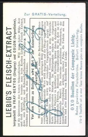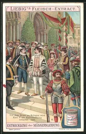 Sammelbild Liebig, Entwickelung der Männerkleidung, Vor dem Dome zu Bologna wird Karl V. zur Kaiserkrönung erwartet 1536