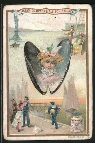 Sammelbild Liebig, Frau in einer Jakobsmuschel, Hafenbild