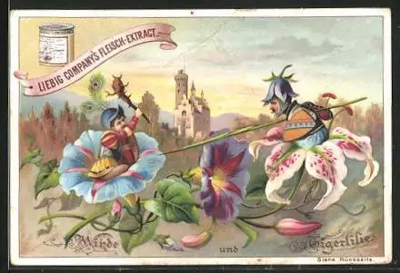 Sammelbild Liebig, Minde und Tigerlilie, zwei Ritter beim Kampf auf Blüten sitzend