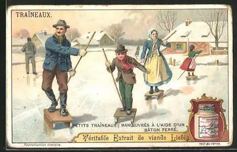 Sammelbild Liebig, Traîneaux, Petits Traîneux manoeuvrés à L`aide d`un Bâton Ferré