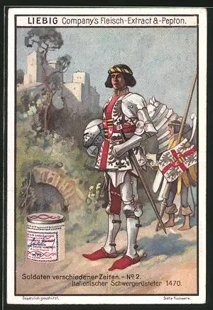 Sammelbild Liebig`s Fleisch-Extract und -Pepton, Soldaten verschiedener Zeiten, Italienischer Schwergerüsteter um 1470
