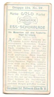 Sammelbild Stollwerck`s Ess-Schokolade, Gold Marke, Die Monarchen auf dem Feldherrnhügel bei Leipzig