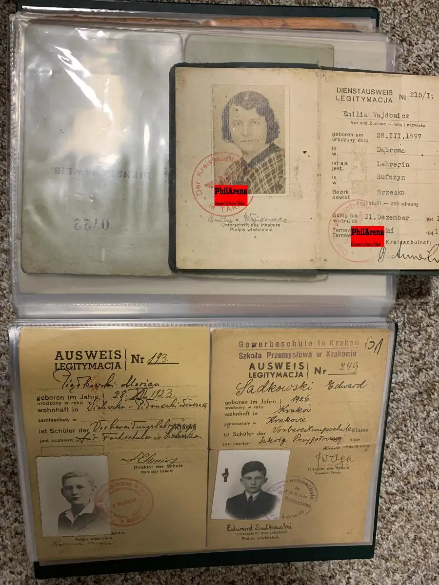 HASAG Tschenstochau, Finanzinspekteur Warschau, Kriegslazarett mot. Krakau, Zeitungsverlag Krk-Wrsch Laborant, Feuerwehr Dienstausweis Chelm, Zieleniewski/Fitzner-Gamper AG Krakau, Universität Lublin Student, Konfektionsfabrik Krakau, Distriktchef Justiz: Burggericht, Stadtverwaltung Kielce, Lehrer Volksschule Zyrardow, Lemberg Vermessungswesen, Landwirt, Deutsch Przemysl Stadtverwaltung, Lubliner Brantwein und Likörfabrik, Lackfabrick Porsa AG in Radom, Polizeiregiment Lublin, Ukrainischer Volksbildungsverein, Karpathen Öl Lemberg, Emissionsbank NL Warschau, Strassenbahnverwaltung Schülerausweis Warschau, Gemeindeverwaltung Tarnogora, Gesundheitskammer Krakau, Sozialversicherungskasse Krakau, Nachtausweis Städt. Krankenhaus Tschenstochau, verschiedene Schülerausweise und Lehrerausweise, Feuerwehrdienst, Kunstgewerbeschule, Servierfräulein im Haus der Presse Krakau, Fernsprechamt Krakau, Baudienstpass, Fäkalien Abfuhr Tomaszow, Grenzausweis, Rotes Kreuz Zakopane, Polnischer Buchverlag, Sonderunterstützung Kalwaria, Stadtverwaltung Kielce, Polizei Stadt Lublin, Befestigungsbau Venus, Evidenz- und Meldeamt Krakau, Fernsprechamt Krakau, Sozialversicherungsanstalt, Vorläufige Kennkarte zur Einbürgerung, Sozialversicherungskasse Stanislau, Kommando der Sicherheitspolizei Stanislau - Kellner, Postamt Tschenstochau, Angelkarte, Tankausweiskarte, Durchgangslazarett Piastow, Forstverwaltung Jabionna/Legionowo, Krankenkasse Kutno, Kies und Sand - Schifffahrtsbeauftrager, Kraftfahrschule, Fahrradausweiskarte, Hermann-Göring-Werke, Starachowice, Liegenschaftsverwaltung, Steueramt, Zivilverwaltung Thorn, Staatsoberförsterei Lukow, Kommando Schutzpolizei Krakau - Luftschutz, Stellungsbau, Regierung des GG, Staatssekretariat, Rüstungs-Kommando Warschau, Stradom AG Tschenstochau, Feldkommandantur 183 - Stanislau, Musiker - Zakopane, Lemberger Zeitung, Dienstausweis Polizei- und Meldeabt. Stadtverwaltung Zakopane, Hauptgruppe Gewerbl. Wirschaft Cholm, Delegierter polnisches Hilfskommitee, Fahrradausweis, Fleischermeister, Stadtverwaltung Radom, Wohnungswesen Krakau, Stadt Cholm, Photograph Abteilung Propaganda Warschau, Notariat Reichshof, Trainer Lizenz Vollblutzucht (Pferde), Einwohnermeldeamt Brodno, IHK Lublin, Nachtausweise, Versicherungs AG, Kürschnermeister Krakau, Staatsförsterei Lublin, Oberförsterei Brody, Bauleitung der Luftwaffe, Stadt Petrikau, Vorläufiger Ausweis EWZ, Identitätsausweis bis zur Ausfolgung von Kennkarten, Sondergästeausweis Staatskasino Regierung Krakau, Devisenstelle, Einstweiliger Amtsausweis, Lagerleitung 1. KL des L.G.K. Kiew-Lemberg, Rüstungskommando Krakau, Gärtner, Elektrizitätswerk Krakau, Landwirtschaftliche Zentralstelle, Transportausweis für gewerbliche Arbeiter, Nachtwächter, Oberbaurat Stadtverwaltung Krakau, Arbeitsausweis Stellungsbau im August 1944, Sonderausweis Flakabt. 373 - Lemberg, Sonderausweis Luftgaukommando, Abt. Justiz-Advokatursapplikant - Krakau, Städtische Sparkasse Krakau, Händlerin Lublin, Polnischer Baudienst, Baudienstpass, Oberförsterei Kampinos, Strassen- und Brückenbauamt Lemberg, Gaswerk Lemberg, Spolem, Waldeisenbahn Zagniersk/Kielce, Hauptgruppe gewerbl. Wirschaft und Verkehr - Inhaber, Schokoladenfabrik Warschau, Geflügelzüchter, Treuhandverwaltung - Sekretär, Kalkwerke Lublin, Wasserwirtschaftsamt Tschenstochau, Gutsverwaltung Dembiny/Cholm, Steinbruch Trembowla, Schenker Krakau, Hauptgruppe Ernährung, Strassenbauamt Zyrardow, Zentralverband Tabakanbauer Opole, Zuckerfarbrik Warschau, Kohlen- und Koksgrosshandlung Krakau, Brauerei Okocim, Charitative Secton - Bürgerliches Hilfskomitee Krakau, Staatsbibliothek Krakau, Baustofflager der Luftwaffe, Sokol, Krupp Stahlbau Minsk, Meisterausweis - Hauptgruppe gewerbl. Wirschaft, Fliegerhorstkommandantur Krakau, Sammelgemeinde Sokal, Steueramt Sochaczew, Philharmonie Krakau, Getreide- und Futtermittelwirtschaft -Debica, LHD Kraft beim Kommando der Schutzpolizei Krakau, Regierung Krakau - Staatskasino, Stickstoffwerk Moscice, Dolmetscher Staatsanwaltschaft, Gaststättenverband Lemberg, IHK Warschau, Staatsbrauerei Kalusz, EWZ-Vorläufiger Ausweis, Durchlassschein, Grenzausweis, Schulleiter, Ostbahn, Kommando Rüstungsbereich Zyrardow, Motorenfabrik Stryj, Schutzschein Niederländische Gesandschaft, Hotel Bristol, Bauleitung beim Kampfkommandant Tschenstochau, Warschauer Maschinenfabriken, Arzt Rybne, Arbeitsausweis beim XX und Polizeiführer, Suchard Krakau, Berufsausweis Arzt, Nachtausweise teils mit Gebührenmarken, Distriktsgruppe Fremdenverkehr Radom, Betriebsleiter - Betriebsinhaber Ausweis, Rüstungskommando Krakau, Monopol Vertriebsgesellschaft, Arbeitsausweis Hauptgruppe Ernährung, Vorläufiger Fremdenpass, Tabakwerk Krakau, Gemeinde Wiszniewice/Cholm, Reichsbahn Bauzug, Tuppen Übungsplatz Debica, Ferrum AG-Dombrowa, Pferdeausweis.