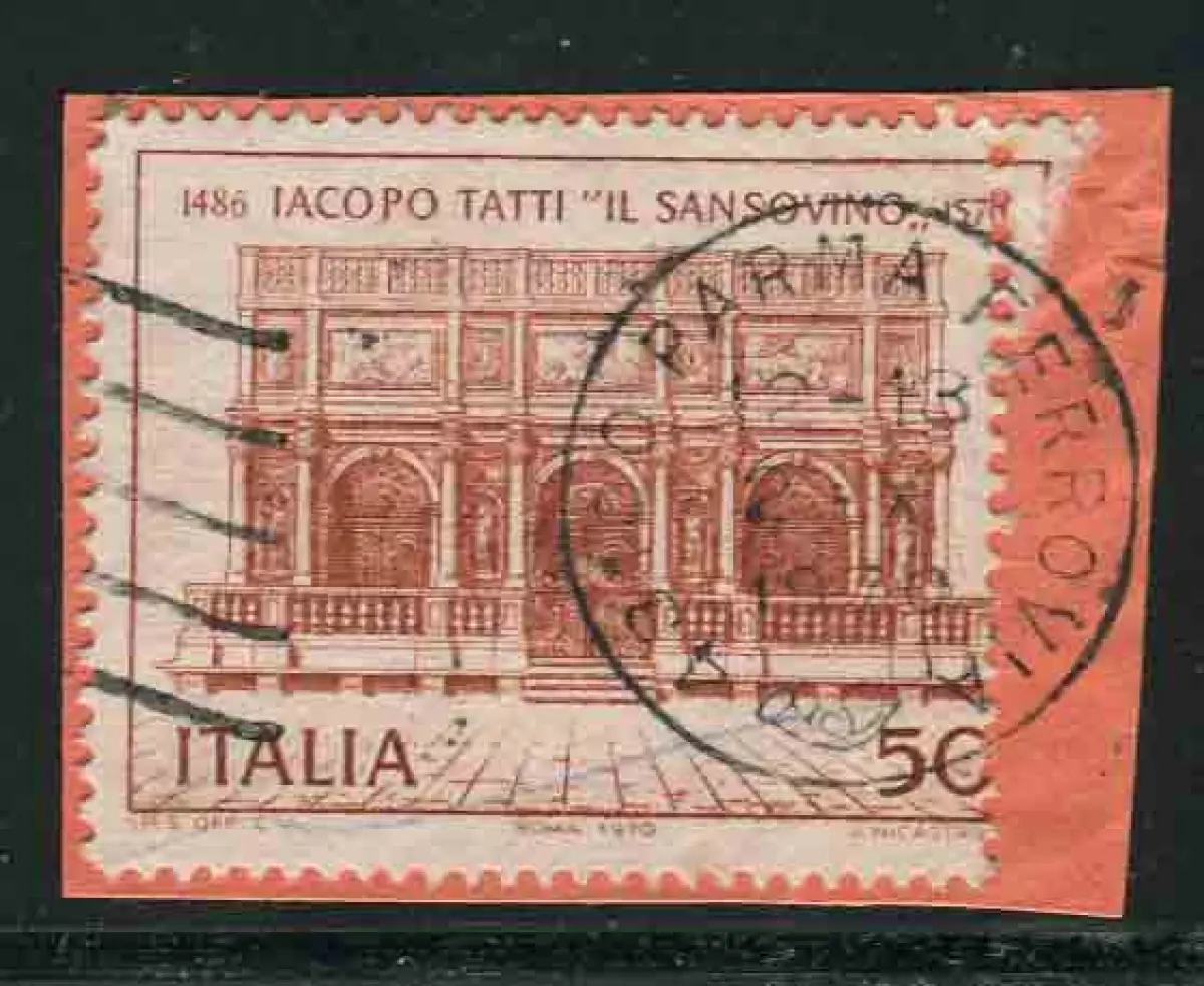 Sansovino Sorte rechts stark verschobene Vertikalverzahnung Fragment - Sansovino Nr. 1129 mit stark verschobenen Rechtsverzahnung (schmalere Briefmarke) - auf kleinem Umschlagfragment vom 2.10.70 - Ungewöhnliche Nr. 824/5