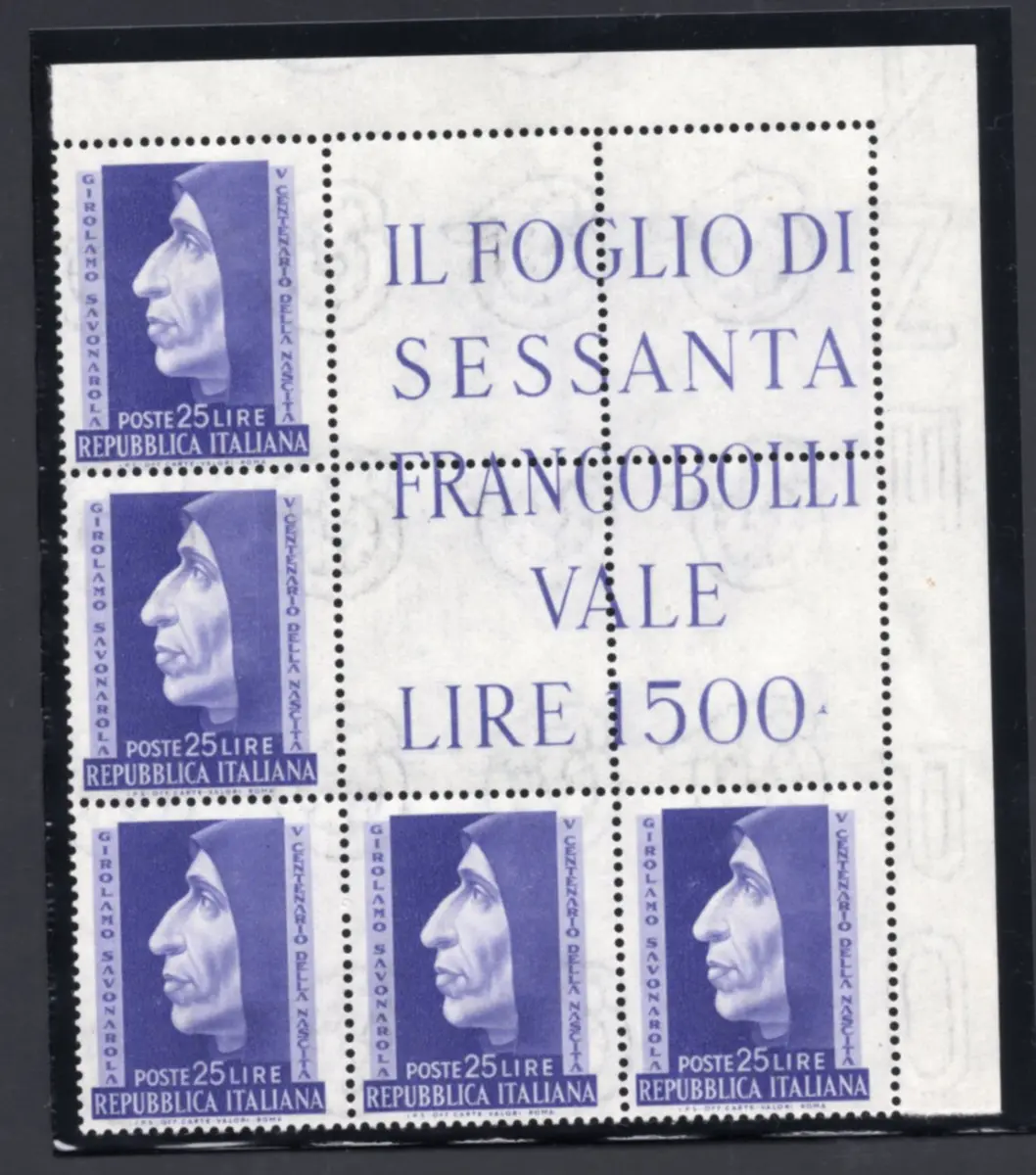 MNH - Vollgummi - Girolamo Savanarola Nr. 696 Eckblock von fünf Exemplaren (Katalog Eckblöcke Nr. 18) perfekt, gut zentriert mit Vollgummi - Kat. euro 70 Cod. 2962/WEB