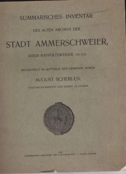 Scherlen, August (Stadtarchivassistent und Lehrer zu Colmar): Summarisches Iventar des alten Archivs der Stadt Ammerschweier, Kreis Rappoltweiler, Ob.-Els, Aufgestellt im Auftrage der Gemeinde.