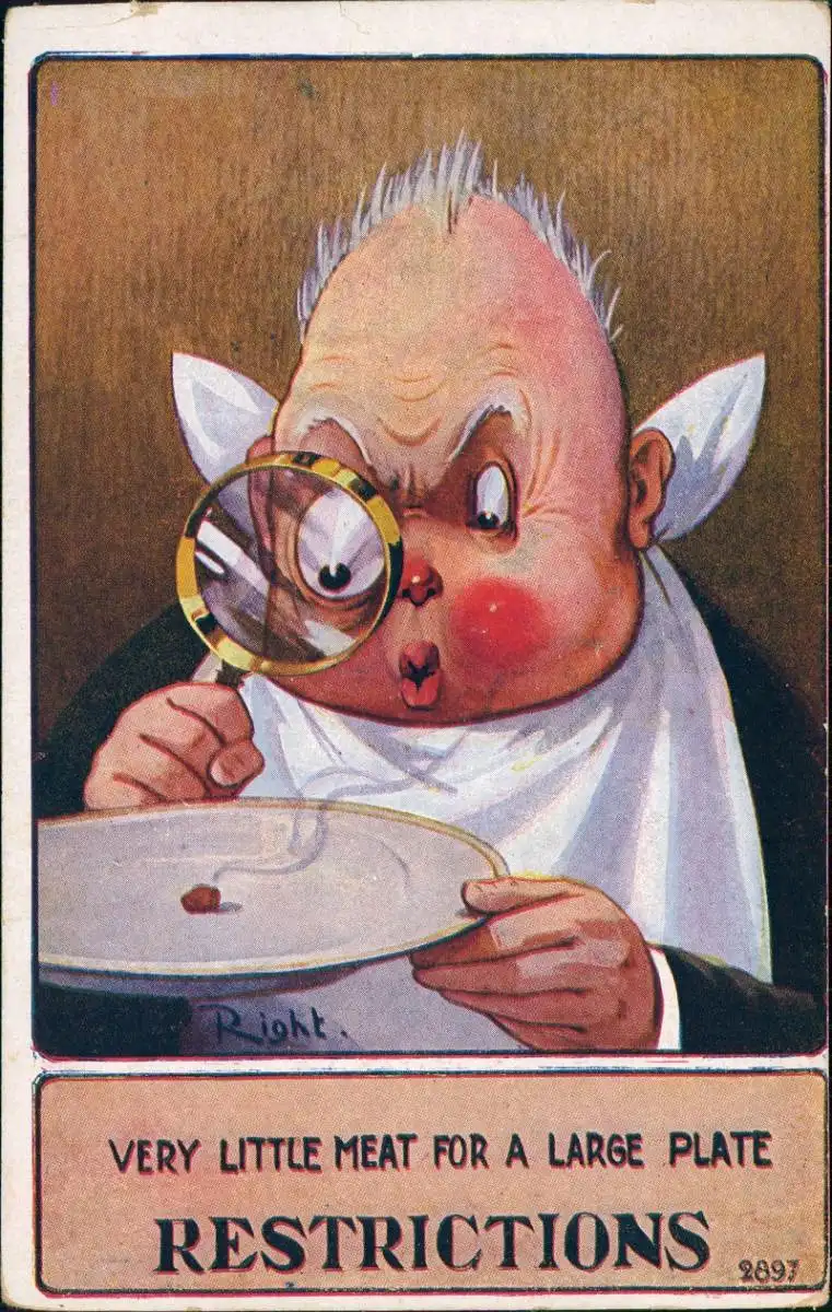 Scherzkarte VERY LITTLE MEAT FOR A LARGE PLATE RESTRICTIONS 1917