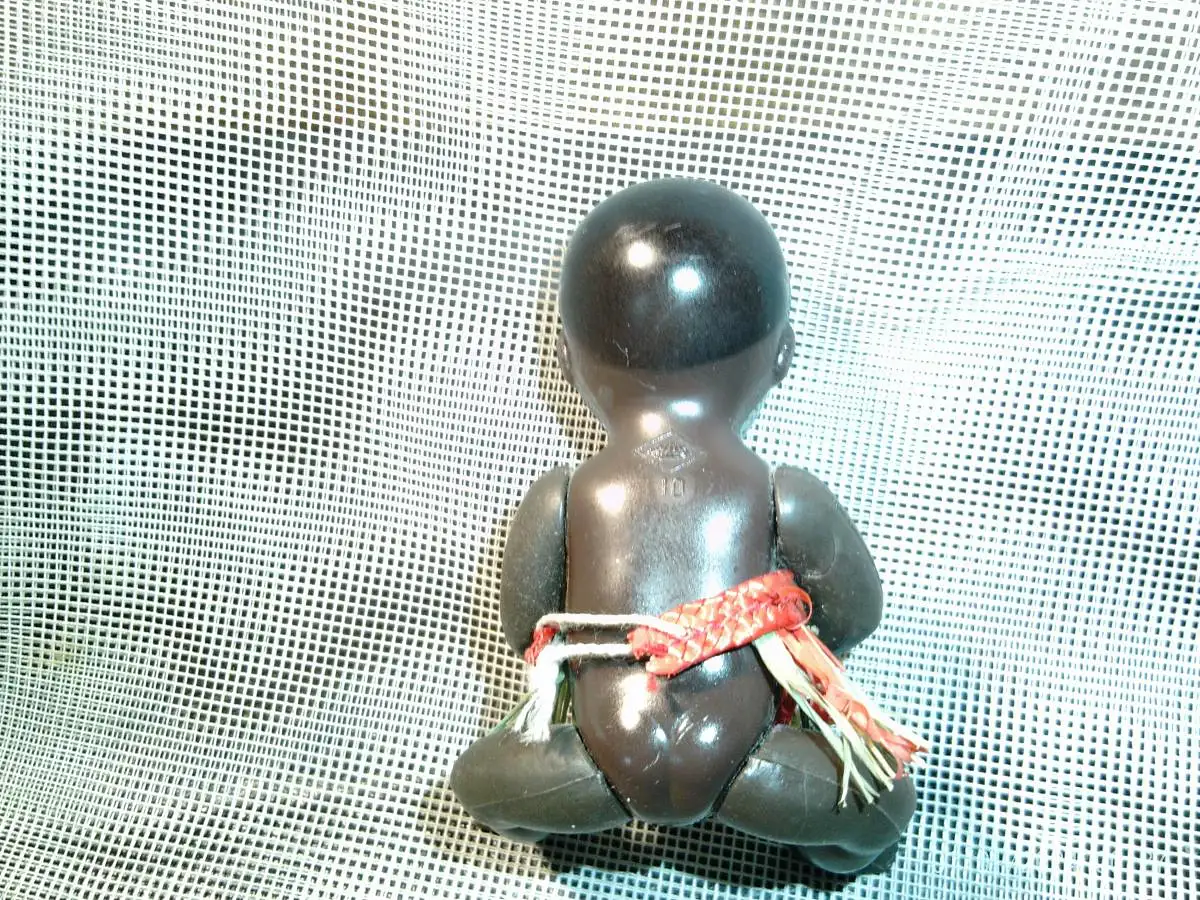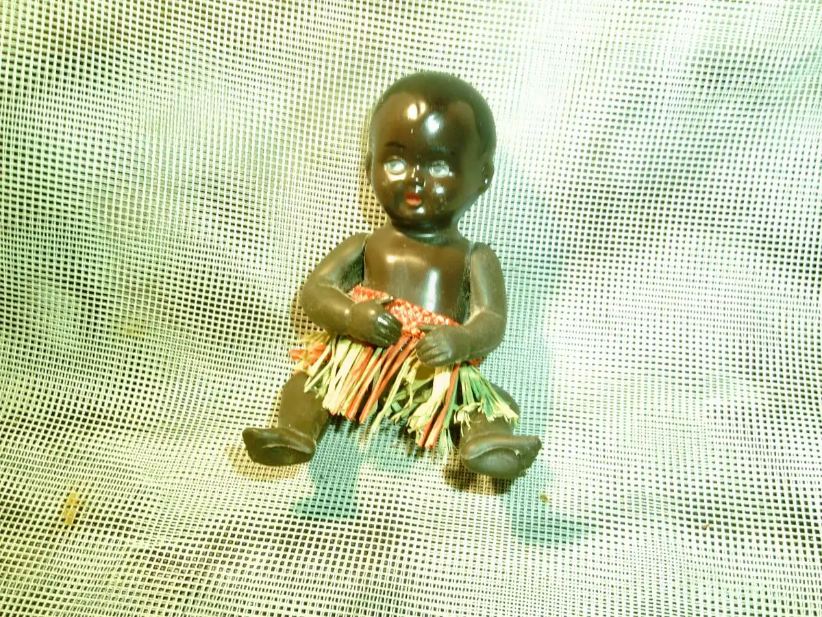 Schildkröte dunkle farbig Puppe um 1945 verso Nr 10 mit Bast Röckchen ! um 1945 verso Nr 10 Höhe : 9 cm