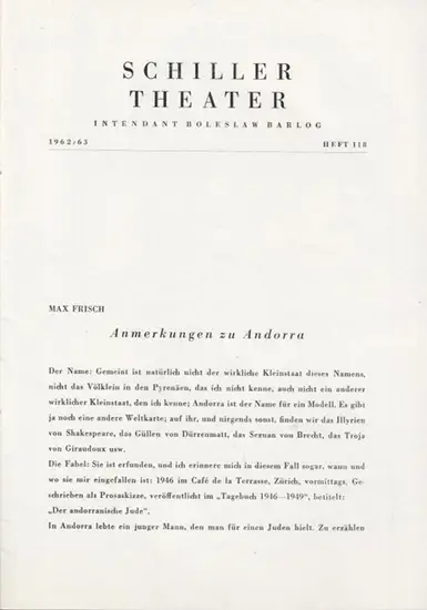 Schillertheater Berlin. - Boleslaw Barlog (Intendanz). - Frisch, Max: Andorra. Programmheft 118 der Spielzeit 1962 / 1963. Inszenierung: Fritz Kortner, mit u. a.: Klaus Kammer, Heidemarie Theobald, Martin Held, Gisela Mattishent.
