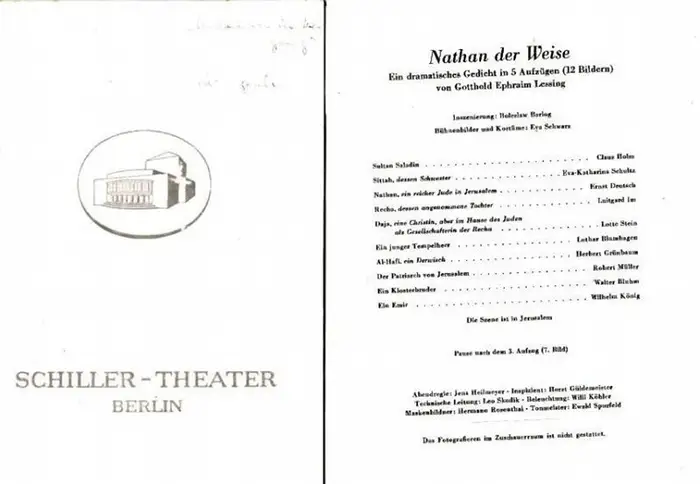 Schillertheater Berlin. - Intendanz: Boleslaw Barlog. - G. E. Lessing: Programmheft zu: Nathan der Weise. Spielzeit 1964/1965, Heft 116. Inszenierung: Boleslaw Barlog, mit u. a.: Ernst Deutsch, Lothar Blumhagen, Claus Holm, Eva-Katharina Schultz.