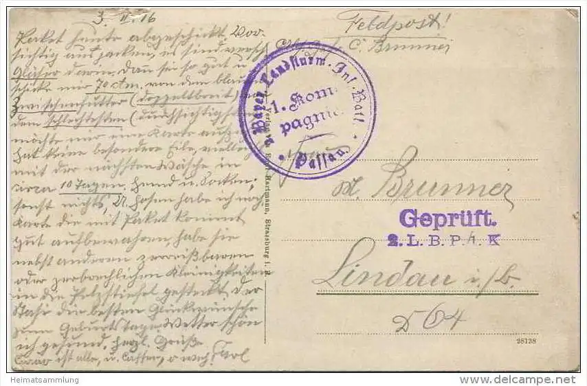 Schirmeck - Feldpost - 2. Bayer. Landsturm-Inf.-Batl. 1. Komp. Passau - Gebrauchsspuren (E14932) gel. 1916