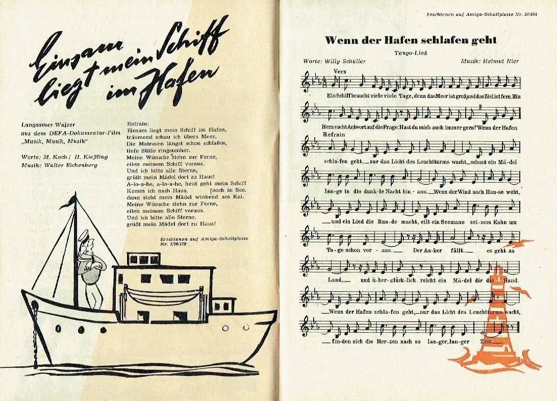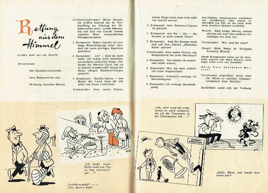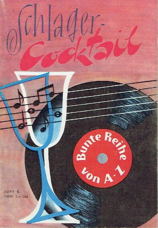 sehr guter Zustand, geringe Gebrauchs- und Alterungsspuren: Umschlag teils mit kleinen Blessuren, zahlreiche Artikel rund um und über Schlager und Tanzmusik, mit vielen damaligen Hits, ihrer Noten und Texte, über Sänger und Sängerinnen, Combos und Komponisten, Filme, Schauspieler und Filmmusik usw. Heinz Quermann, Gerd Natschinski, Günter Simon, Klaus Gross, Alexander Hegarth, Gitta Lind, Kurt Schmidtchen, Alice Prill, Willi Kollo, Fred Raymond, Rudolf-Günter Loose, Rita Lindner, Julia Axen, Bärbel Wachholz u. v. a.  Spiller/Opitz 271/6, Softcover, ca. 14 x 20,5, 60 Seiten mit zahlreichen Bildern