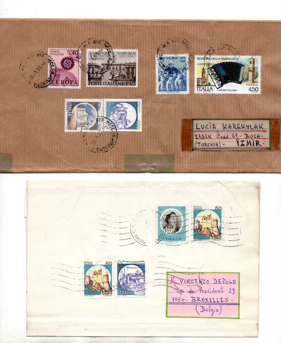 BEUTEL - Schlösser Ganzsache Ausschnitt per Post gebraucht - Zwei frankierte Bänder mit auch einem 400 Lire Exemplar der Postkarte, die zur Vervollständigung des Tarifs ausgeschnitten wurde - Eine Reise nach Belgien und eine in die Türkei - Interessante Verwendung und Ziele - für Ausgabespezialist Cod.453/182