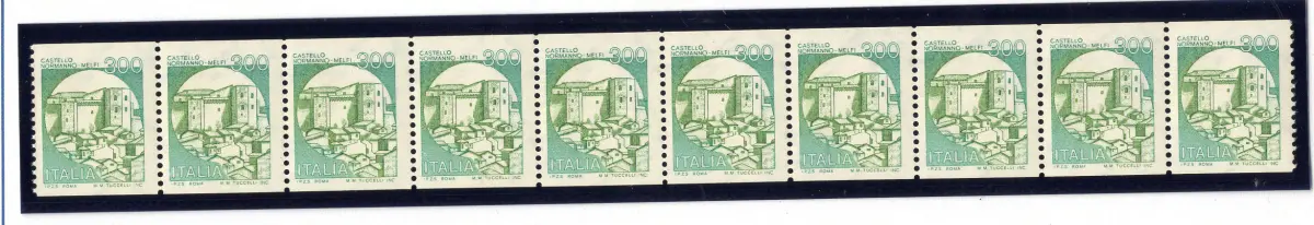 MNH - Vollgummi - Schlösser Spulenausgabe Lire 300 Streifen von zehn Exemplaren ohne die fortlaufende Nummer, die normalerweise auf der Rückseite in schwarz alle fünf Marken gedruckt wird - Ungewöhnlich für Ausgabespezialisten Cod. 881/17