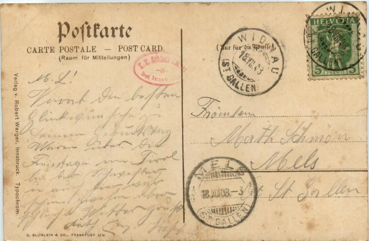 Danke. Alles Bestens. Können Sie mir allenfalls mitteilen, aus welchem Jahr die Postkarte stammt? Besten Dank.