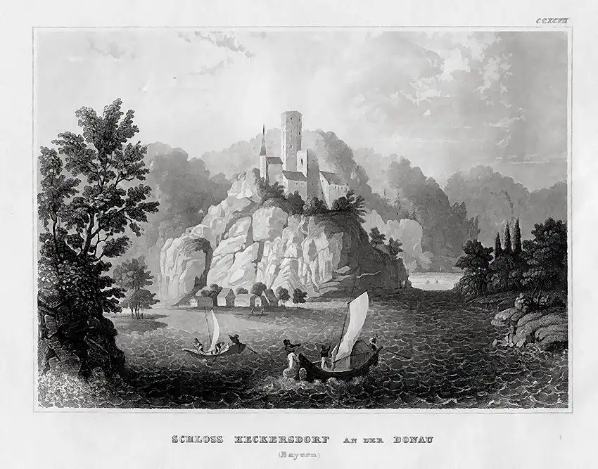 Schloss HECKERSDORF an der Donau. Stahlstich um 1840