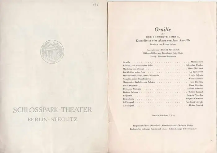 Gr.-8° (21 cm x 15 cm). Originalprogrammheft. 16 Seiten. Mit eingelegtem Besetzungszettel zu Anouilh Ornifle (1 Doppelblatt). Mit s/w Szenenfotos zu diesem und anderen Stücken aus dem Spielplan, Anzeigen und Werbung zzgl. Doppelblatt mit aktueller Besetzung. Gut erhalten