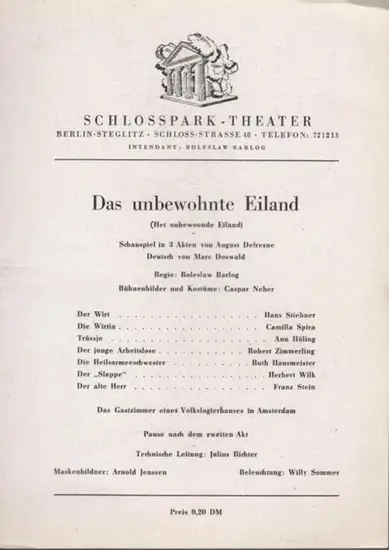 Schlossparktheater Berlin. - Boleslaw Barlog (Intendanz). - August Defresne: Das unbewohnte Eiland. Programmzettel. Inszenierung: Boleslaw Barlog, mit u. a.: Camilla Spira, Hans Stiebner, Ann Höling, Robert Zimmerling, Herbert Wilk. // Anzeigen weiterer S