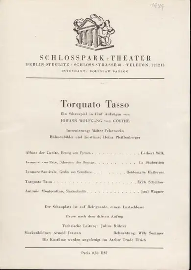 Schlossparktheater Berlin. - Boleslaw Barlog (Intendanz). - J. W. v. Goethe: Torquato Tasso. Programmzettel. Spielzeit 1948 / 1949. Inszenierung: Walter Felsenstein, mit Erich Schellow, Lu Säuberlich, Herbert Wilk, Heidemarie Hatheyer und Paul Wagner. //
