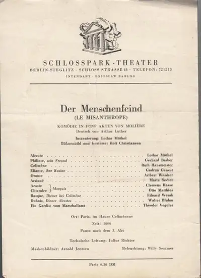 Schlossparktheater Berlin. - Boleslaw Barlog (Intendanz). - Moliére: Der Menschenfeind. Programmzettel. Inszenierung: Lothar Müthel, mit u. a.: Aribert Wäscher, Lothar Müthel, Walter Bluhm, Ruth Hausmeister, Gudrun Genest.