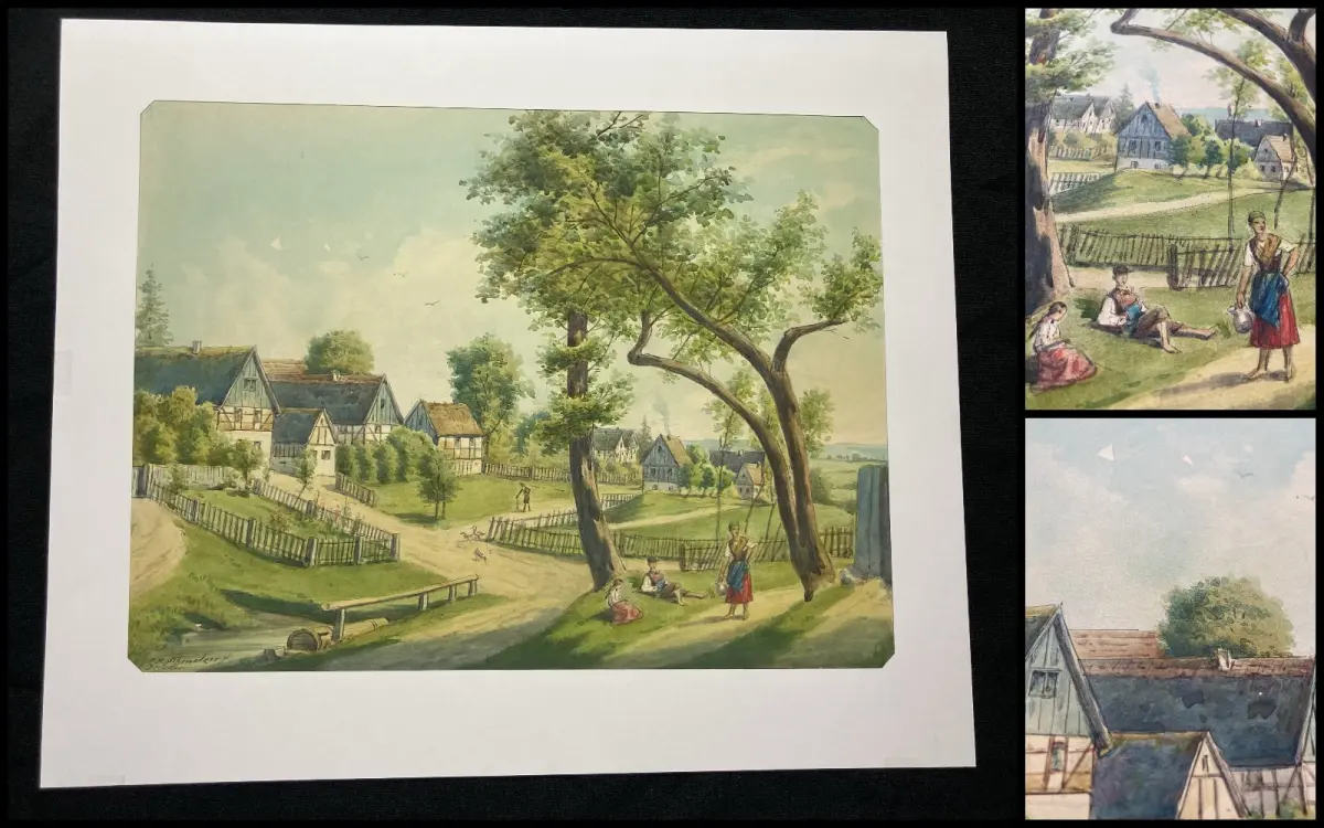 Johann, Bernhard Schmelzer 1833- am 26. Dezember in Annaberg als viertes Kind des Grenzzolleinnehmers in Kühnhaide- später Steuereinnehmer und Postverwalter- Christian Ehrenfried Schmelzer und seiner Ehefrau Chritiane Sophie Schmelzer, geb. Rossmann, geboren. Sein Vater starb früh, somit war die Familie unterstützungsbedürftig. 1848- 1860 Studium an der Dresdner Kunstakademie. Er war dort später Schüler von Julius Hübner in Historienmalerei. 1856 Erhielt er die"Kleine goldene Medaille"- eine hohe Auszeichnung- für sein Gemälde" Der Tod des Wilddiebs". ab 1860 Schüler bei Ludwig Richter in Dresden in Landschaftszeichnen. Auch starke Beeinflussung durch dessen Genrekleinkunst. um 1860-1892 Tätigkeit für mehrere Verlage verchiedener Städte als Illustrator von Kinderbüchern und Jugendzeitschriften. Außerdem Mitarbeit bei den "Dresdner Nachrichten" als bedeutender Humorist und Karikaturist. bis 1909 Aus Notlagen heraus, Ausführung von Werbeaufträgen was damals negativ bewertet wurde und sein Ansehen schädigte. 1909 am 10.September in Dresden an Armut gestorben. unten links signiert: J. B. Schmelzer f. Dresden