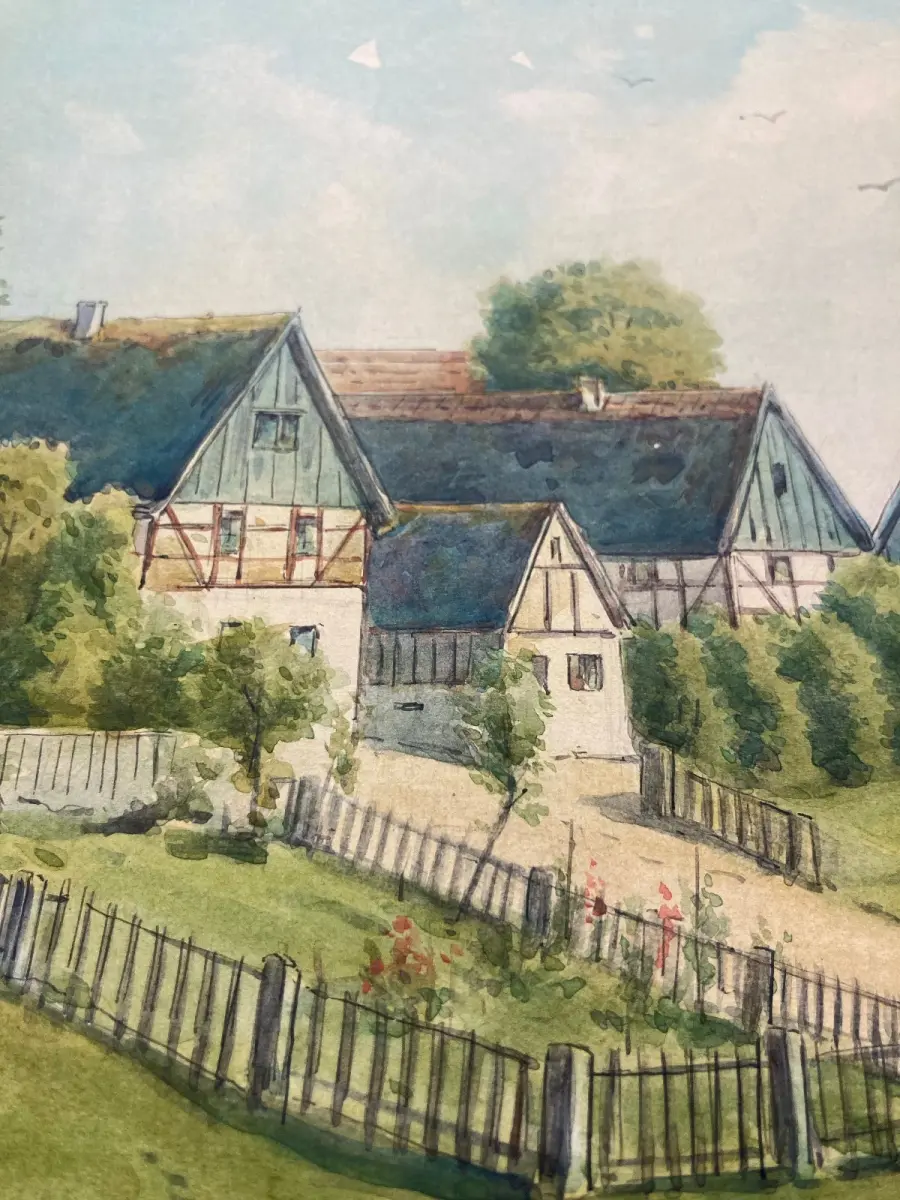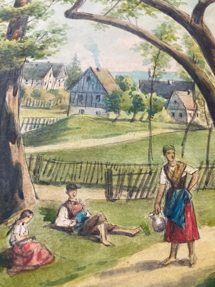 Aquarell und Papprahmen von vorn im super Zustand, verso unten links mit schrägem Eckabriss von 3,5 cm und leicht braunfleckig