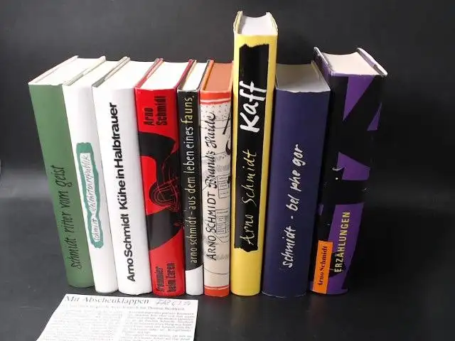 Arno Schmidt. Konvolut mit 9 Büchern: 1) Die Ritter vom Geist; 2) Die Gelehrtenrepublik; 3) Kühe in Halbtrauer; 4) Trommler beim Zaren; 5) Aus dem Leben eines Fauns; 6) Brand´s Haide; 7) Kaff auch Mare Crisium; 8) Belphegor; 9) Erzählungen. Besitzvermerk (Buch 5). Alle Bände mit gutem Gesamtzustand. Mit einem Zeitungsausschnitt als Beilage