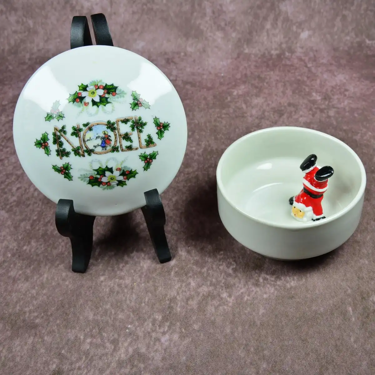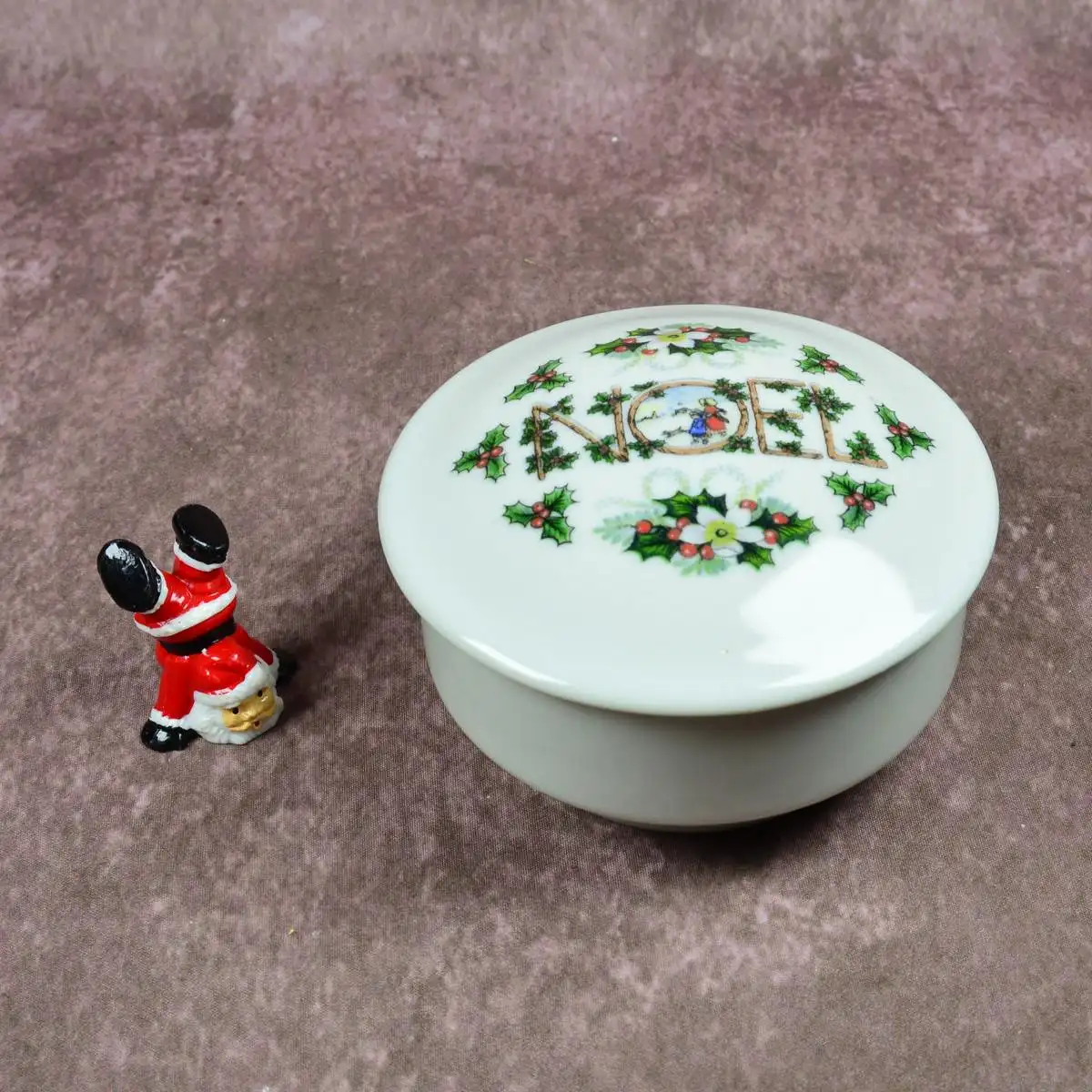 Porzellan-Schmuckdose von Reutter mit weihnachtlichem Design, handbemaltem „NOEL“-Motiv, umgeben von Stechpalmen, weißen Blumen und roten Beeren, sowie einer Santa-Figur im Inneren. Sehr guter Zustand. Ideal für Sammler, Schmuckaufbewahrung oder als festlicher Dekor-Akzent.