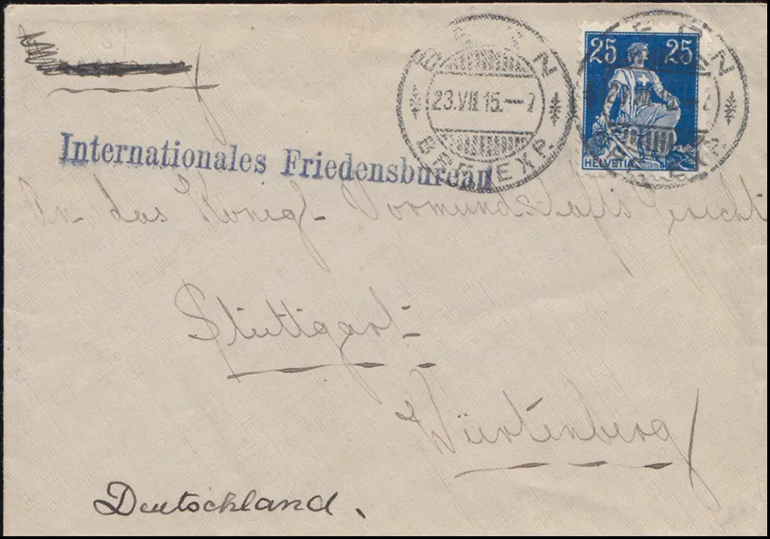 portogerechter Auslandsbrief "Internationales Friedensbüro" in Bern an das Königl. Vormundschaftsgericht in Stuttgart / Württemberg