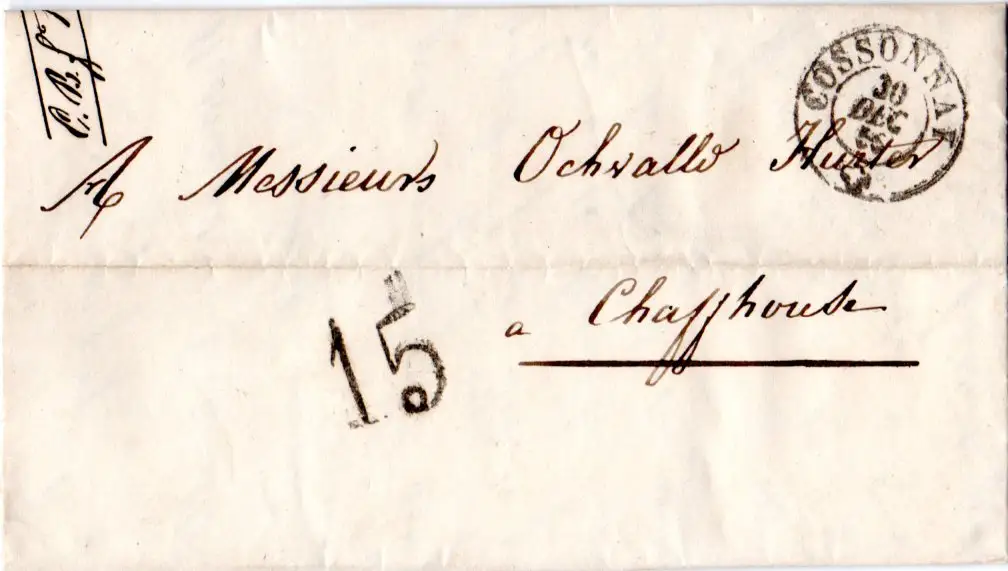 Schweiz 1856, Portostpl. 15 auf Brief v. COSSONAY n. Schaffhausen.