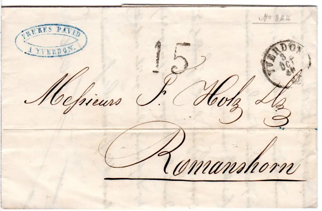 Schweiz 1856, Portostpl. 15 auf Brief v. Yverdon n. Romanshorn