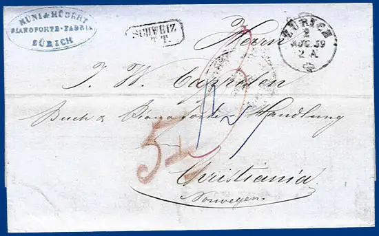 1859, Portobrief Zürich-Christiania mit R2 SCHWEIZ N.T.T.. Schiffsbrief via Hamburg (Transitstpl. rs.). Porto 27 Skilling.