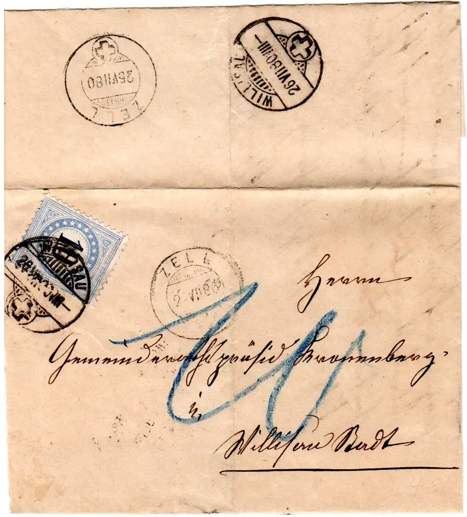 Schweiz 1880, 10 C. Porto auf Brief v. Zell n. Willisau