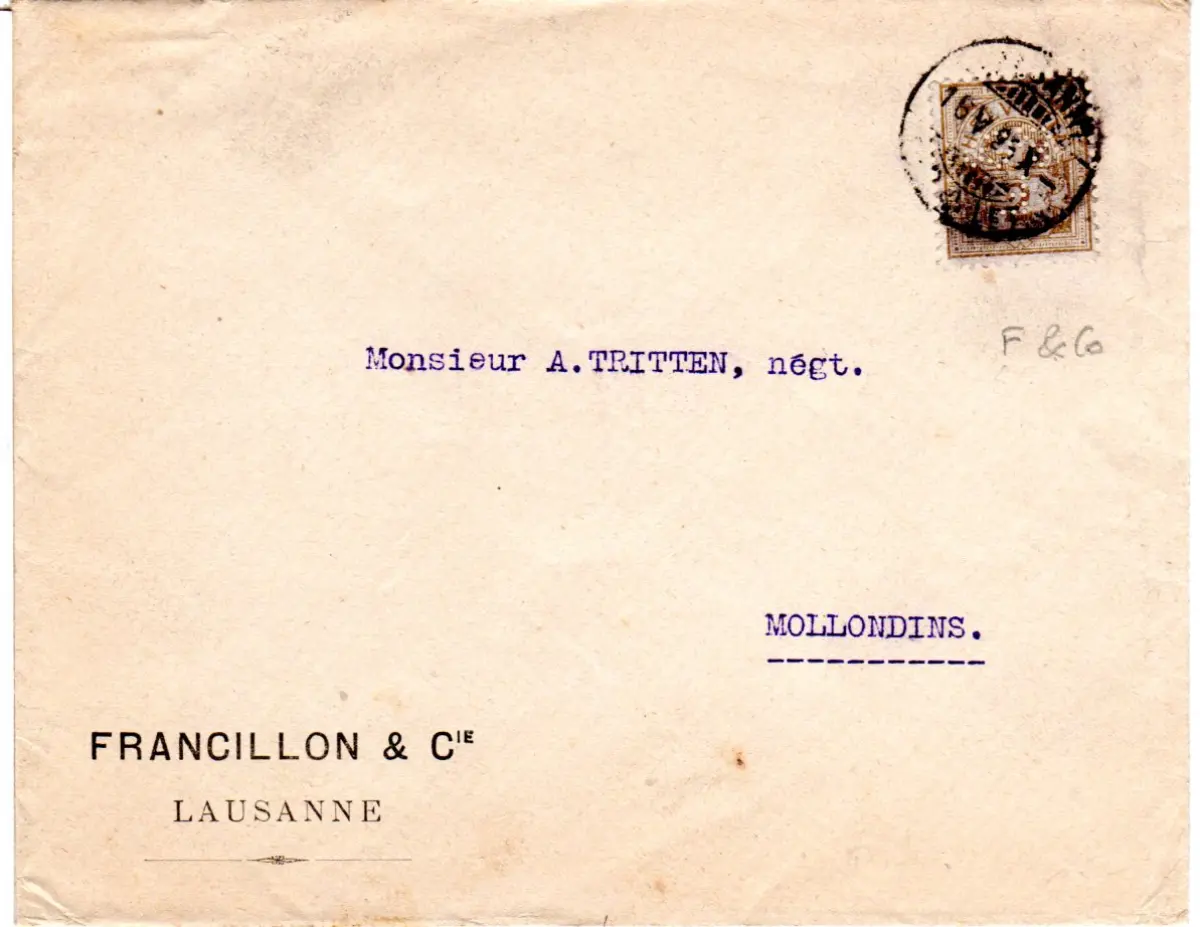 2 C. m. Firmenlochung F & Co auf Francillon & Co. Firmenumschlag v. Lausanne. Ernest Francillon wareiner der Wegbereiter von LONGINES Uhren.