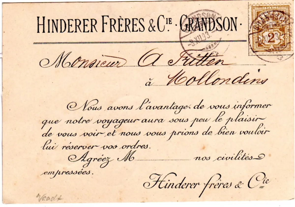 Schweiz 1893, 2 C. auf Vertreter-Avis Karte v. Grandson