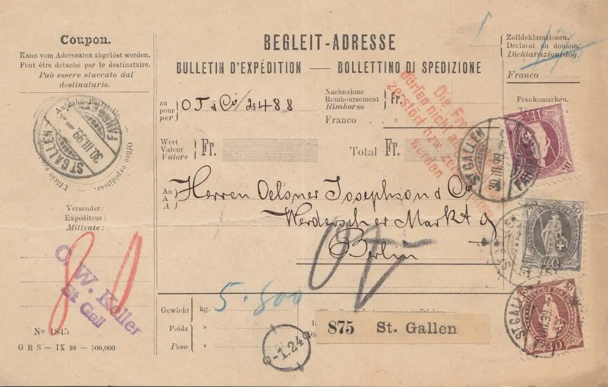 Schweiz: 1899: Begleit Adresse St. Gallen nach Berlin