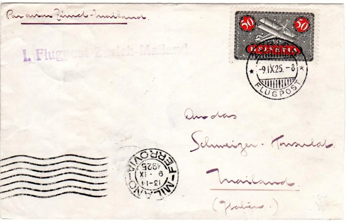 Schweiz 1925, 1. Flugpost Zürich-Mailand, Brief m. 50 C.