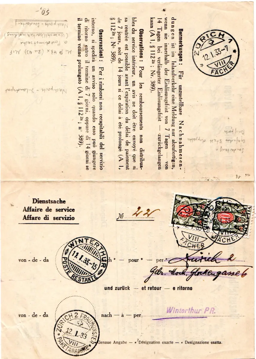 Postformular v. Winterthur Poste Restante m. senkr. Paar 10 C. Porto u. Entwertung Zürich Fächer.